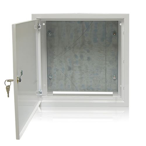 Montážní ochranná uzamykatelná skříň s montážní plotnou pro umístění technologie např. přístupového nebo kamerového systému s ventilací Skříň je vyrobena z pozinkovaného materiálu s ochranou proti zrezivění a s povrchovou úpravou bílé barvy. Po odstranění krytek lze získat otvory pro kabeláž na horní a spodní straně.